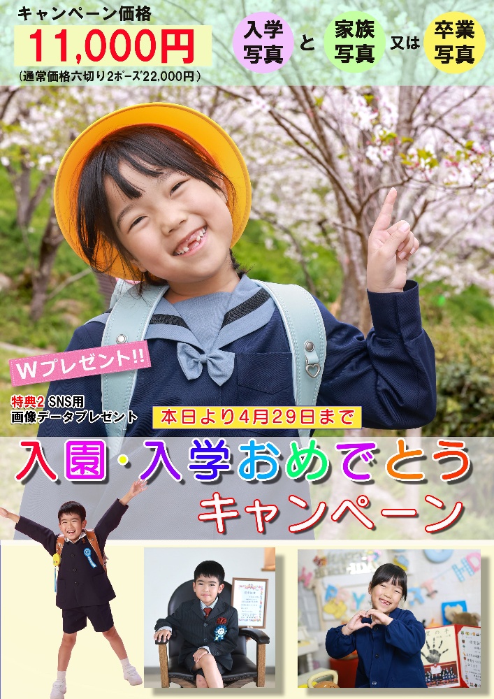 50組限定、入学写真を撮ると家族写真か卒業写真、1ポーズサービス(約A4サイズ) 2ポーズ11,000円